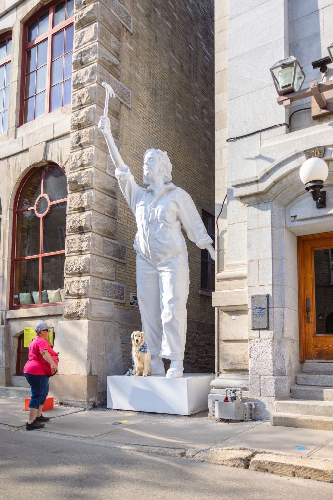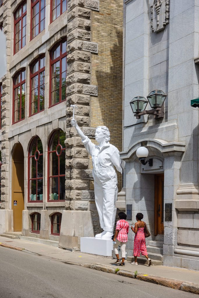 La sculptrice: Mousse de polystyrène, acier, fibre de verre, époxy, 2021. Oeuvre présentée dans le cadre de l’événement Les passages insolites, Ville de Québec, Canada.