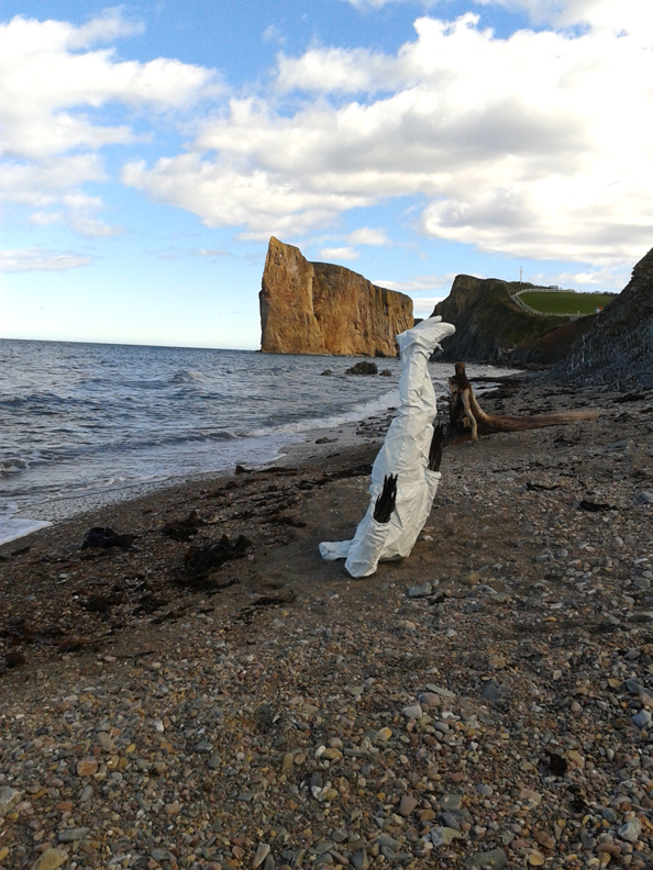 FOOLS: Clothing, paint, feathers, rocks and plaster, 3x20x5 feet, 3x5x4 feet and 5x4x3 feet, 2012. Works produced as part of the Percé summer residence and presented during the 2012 days of culture in Percé.